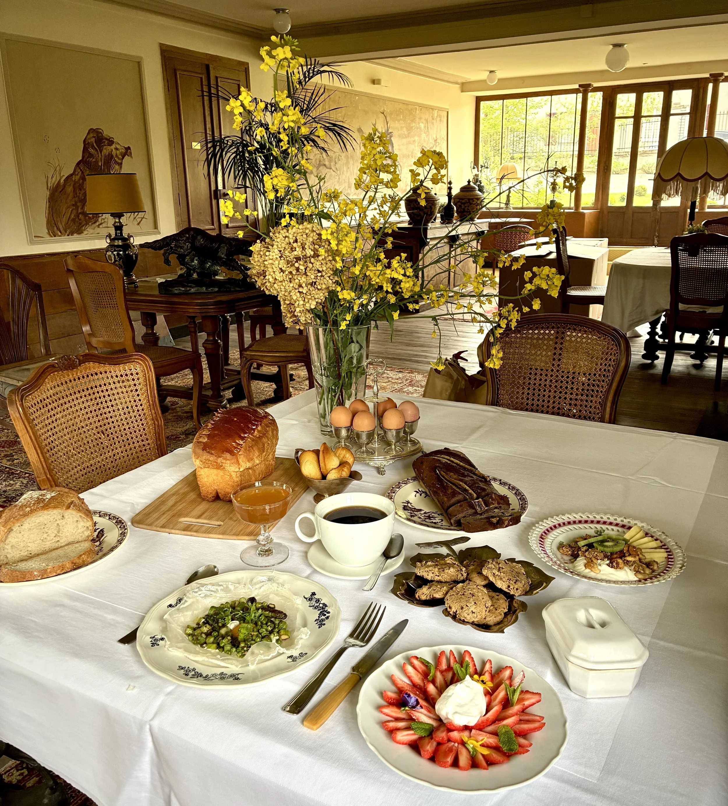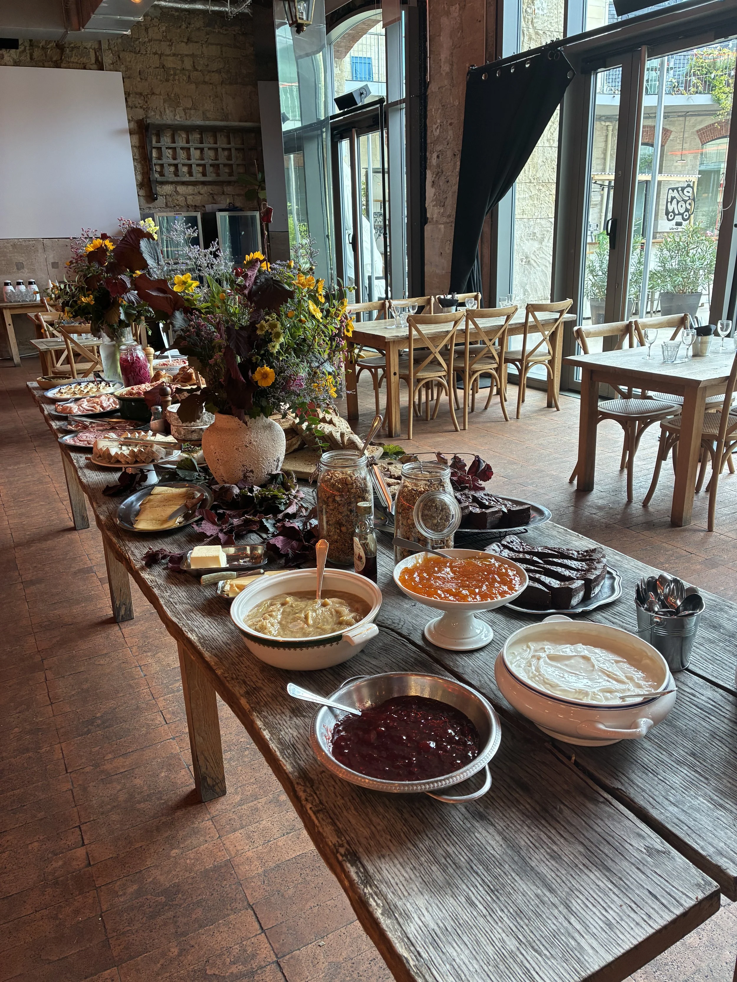 Buffet de petit-déjeuner avec des confitures, des toasts, des céréales, et des plats en sauce, dans un restaurant lumineux avec des murs en pierre et de grandes fenêtres.