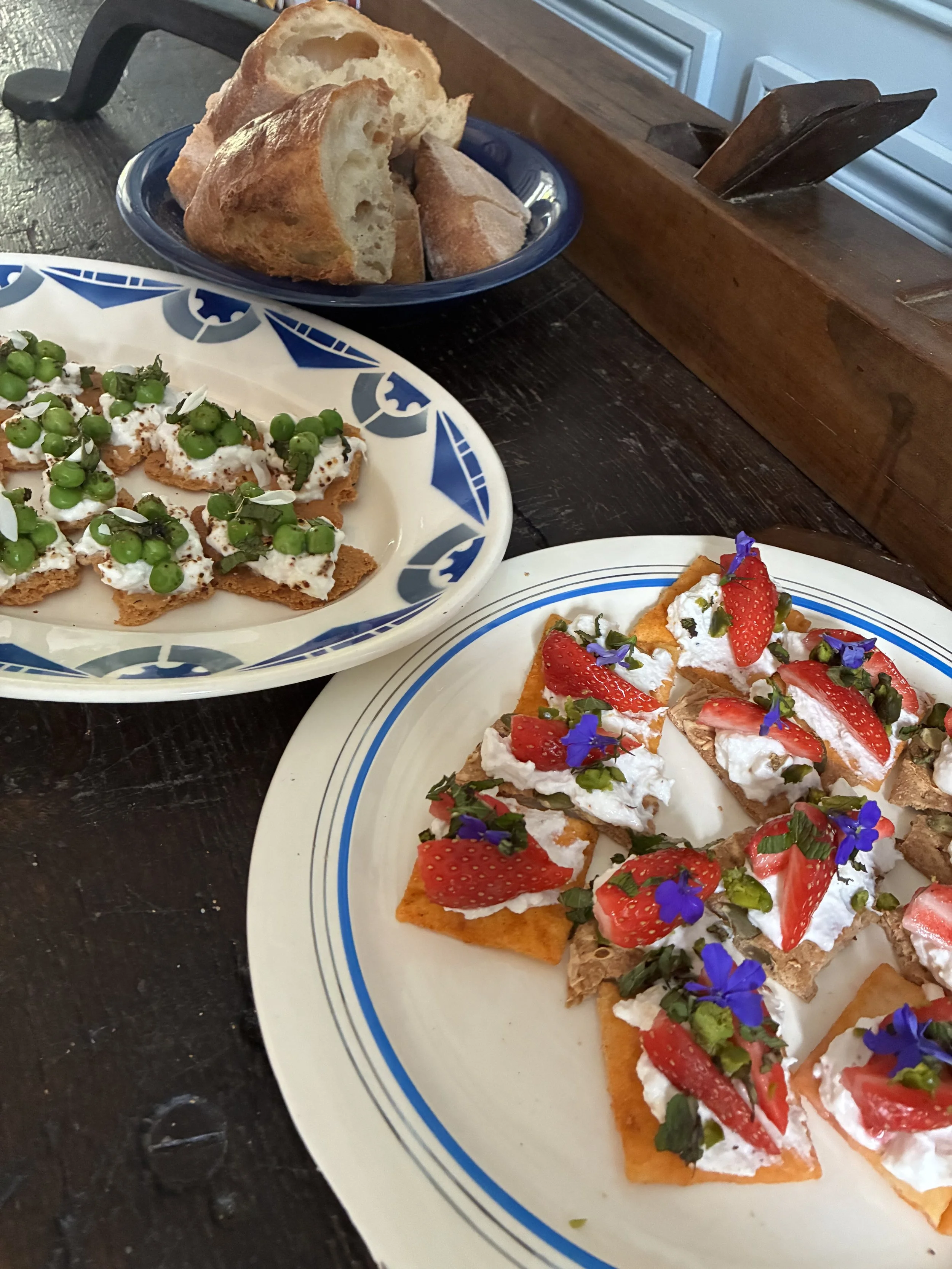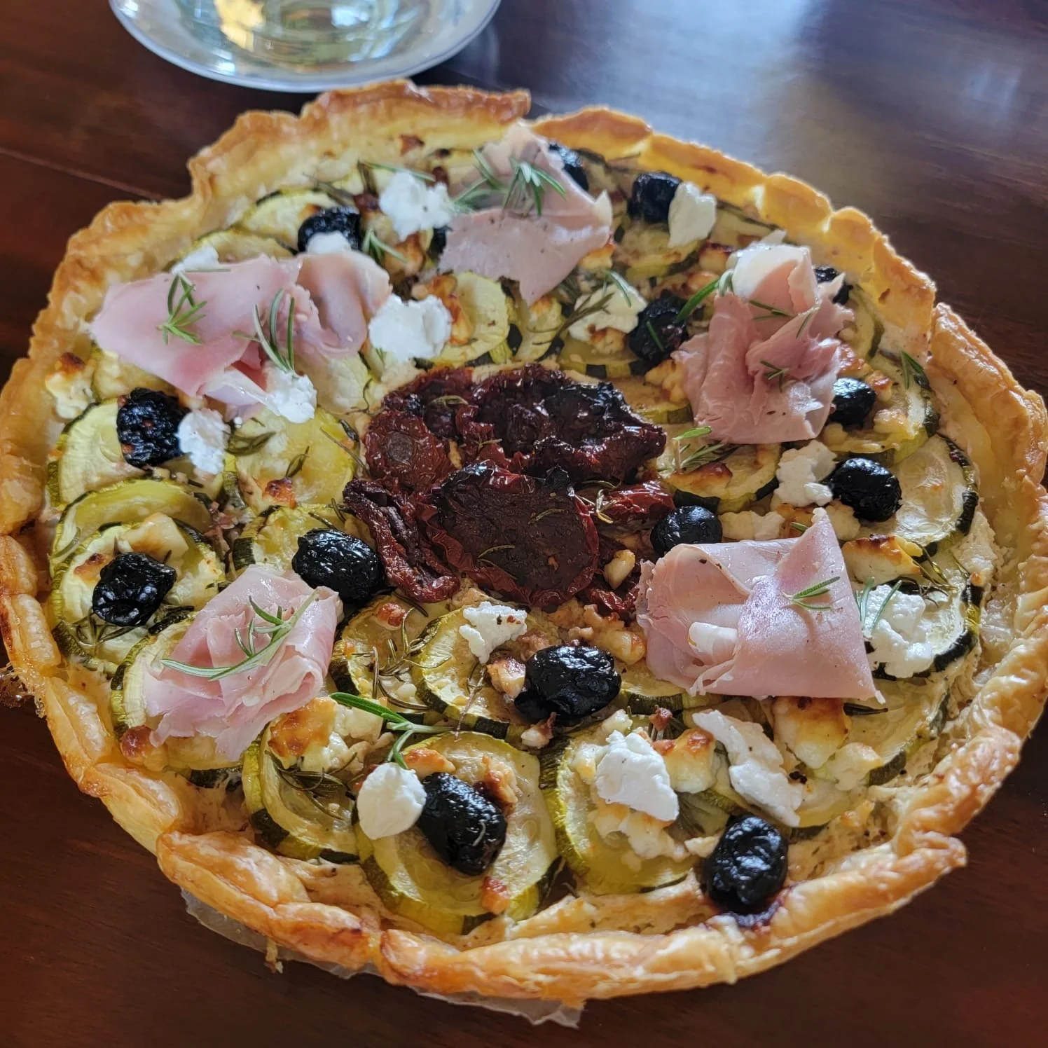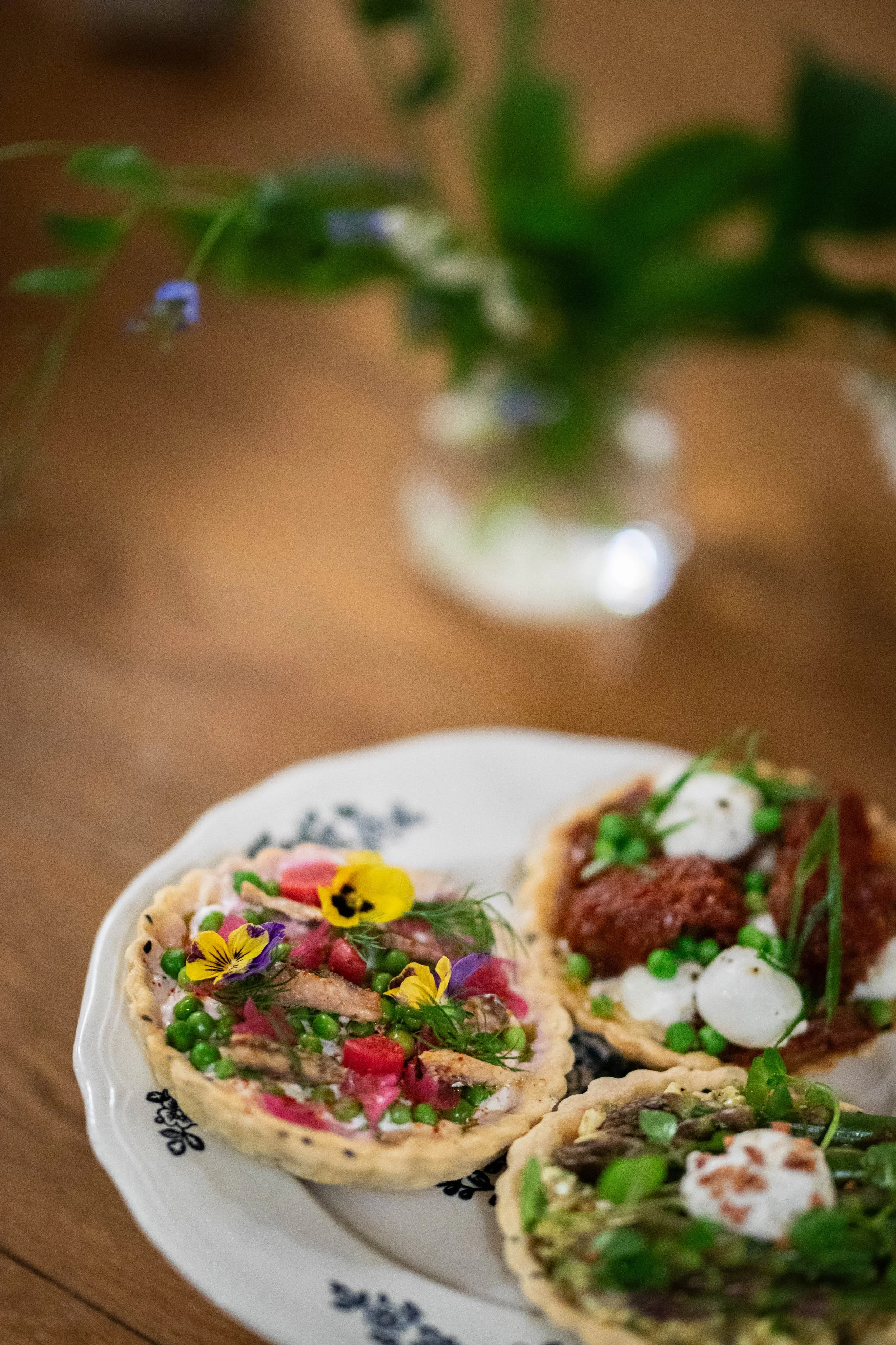 Tartelette salée garnie de légumes, fleurs comestibles, et herbes, servie sur une assiette dorée