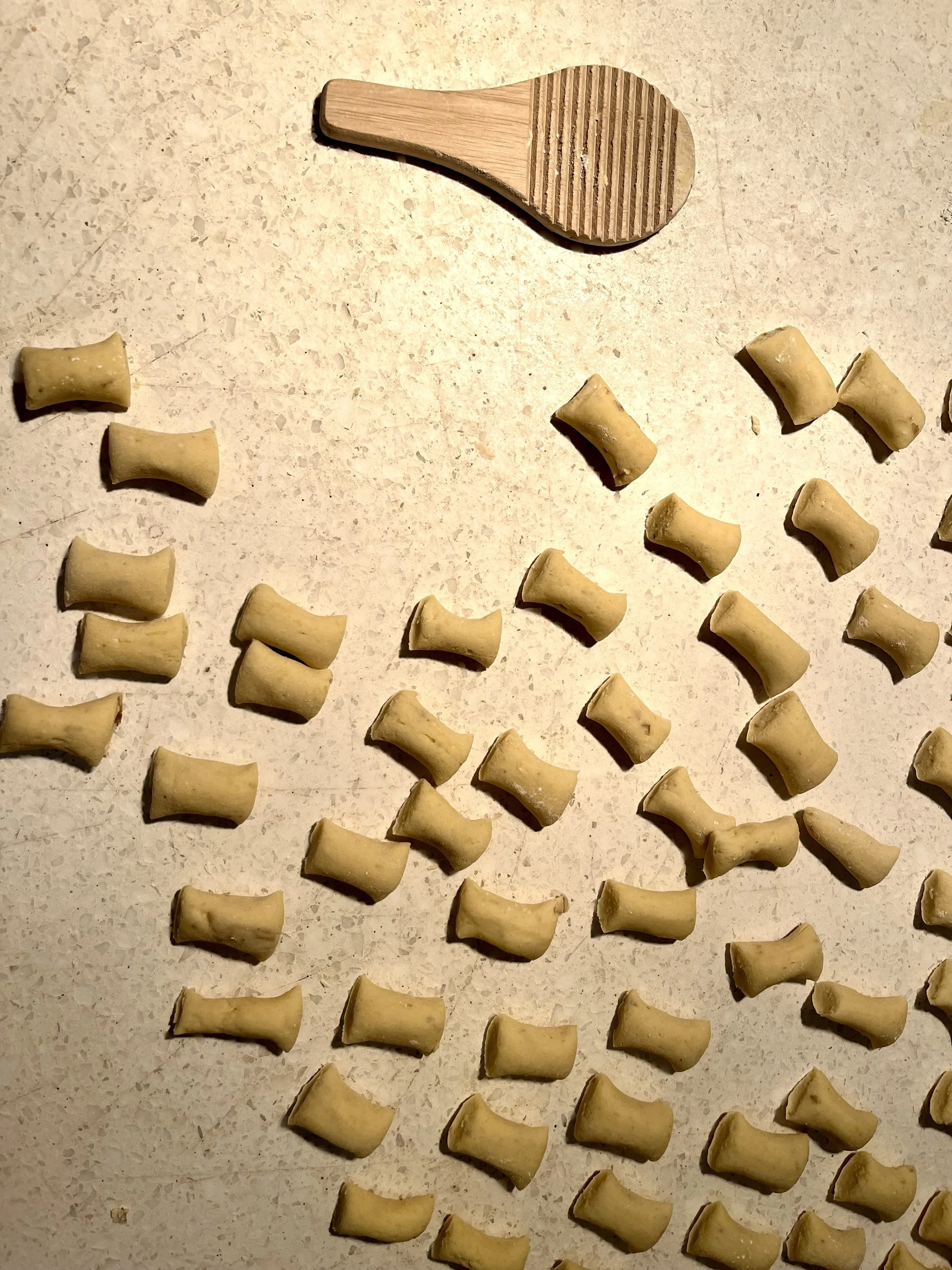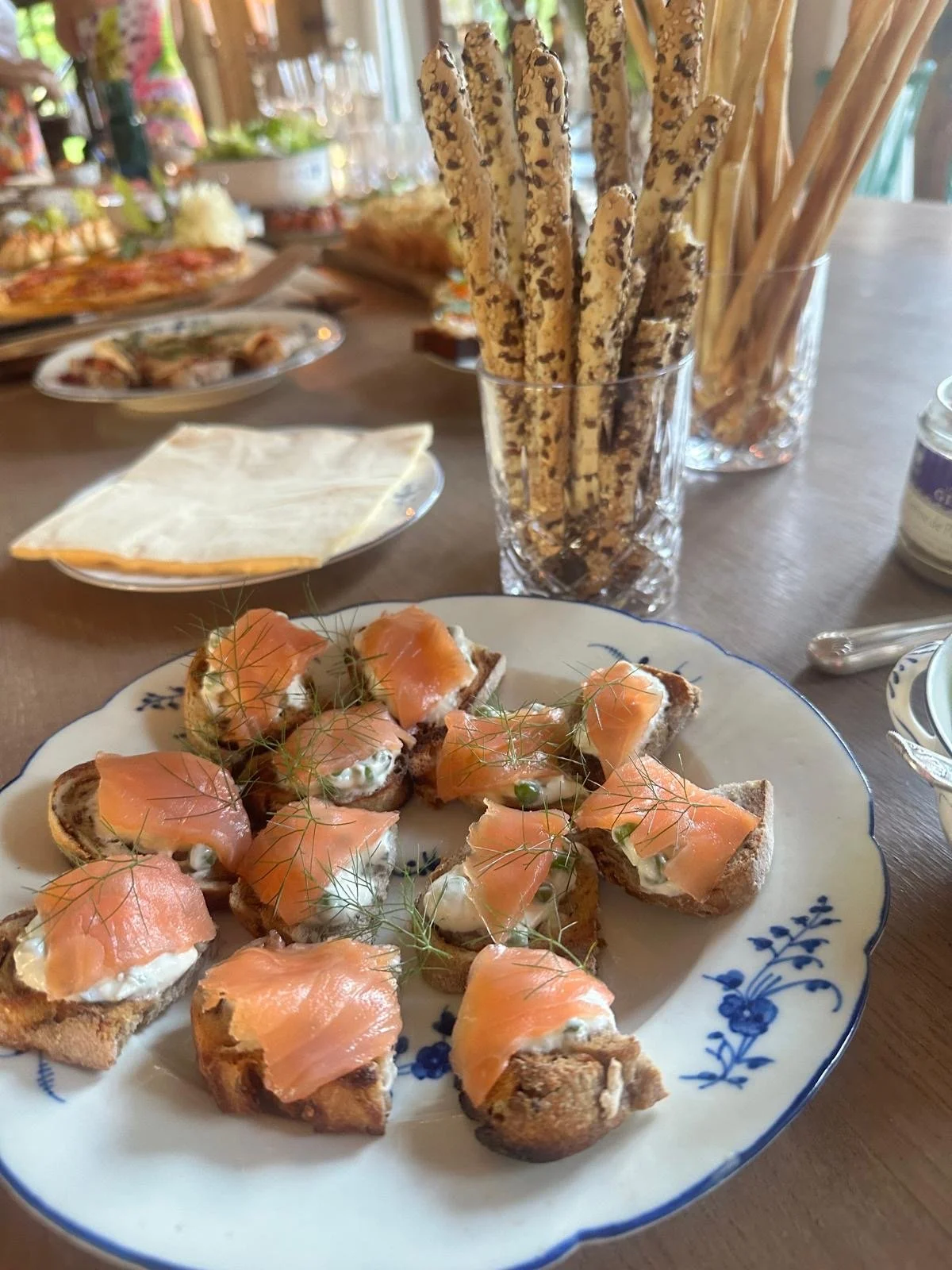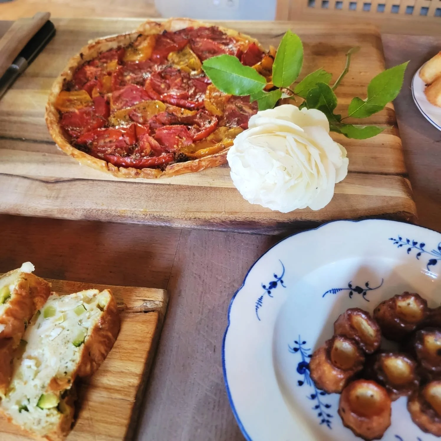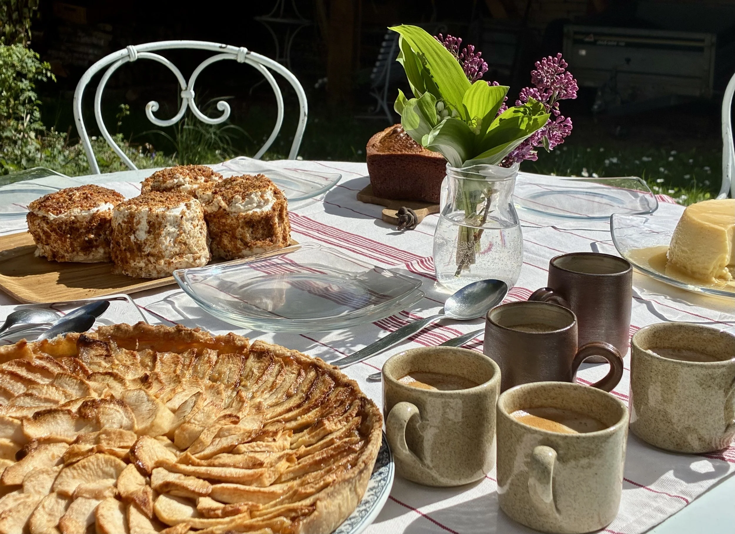 Table dressée pour un repas en plein air avec une tarte aux pommes, un gâteau, des tasses à café, un vase avec des fleurs, et des plats avec du beurre et des biscuits, sous un soleil éclatant.